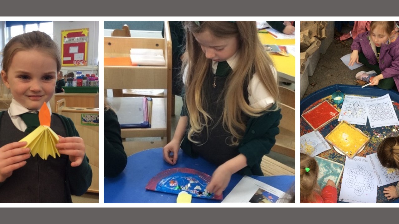 The children relished the opportunities to create beautiful and colourful artwork, including diva lamps and enjoyed exploring and making their own Rangoli rice patterns.