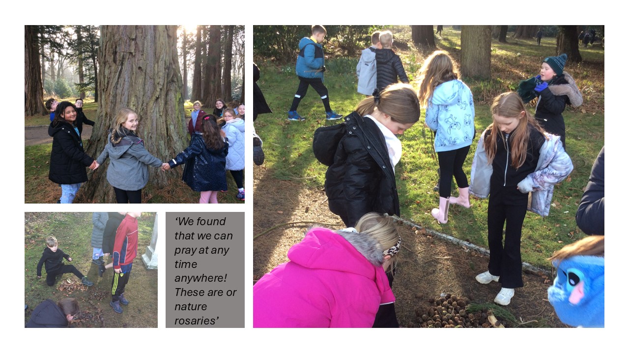 One of the activities the children take part in is making the prayer rosary out of items the children could find in the woodland area. We talked about what the rosary was made up of and they used twigs, pines cones etc to construct it. We then said a section of the rosary.